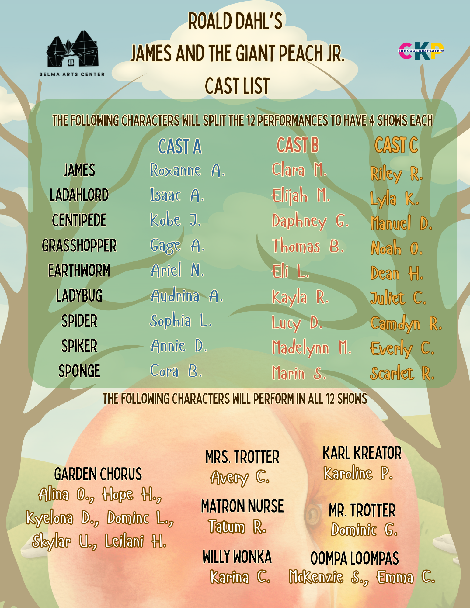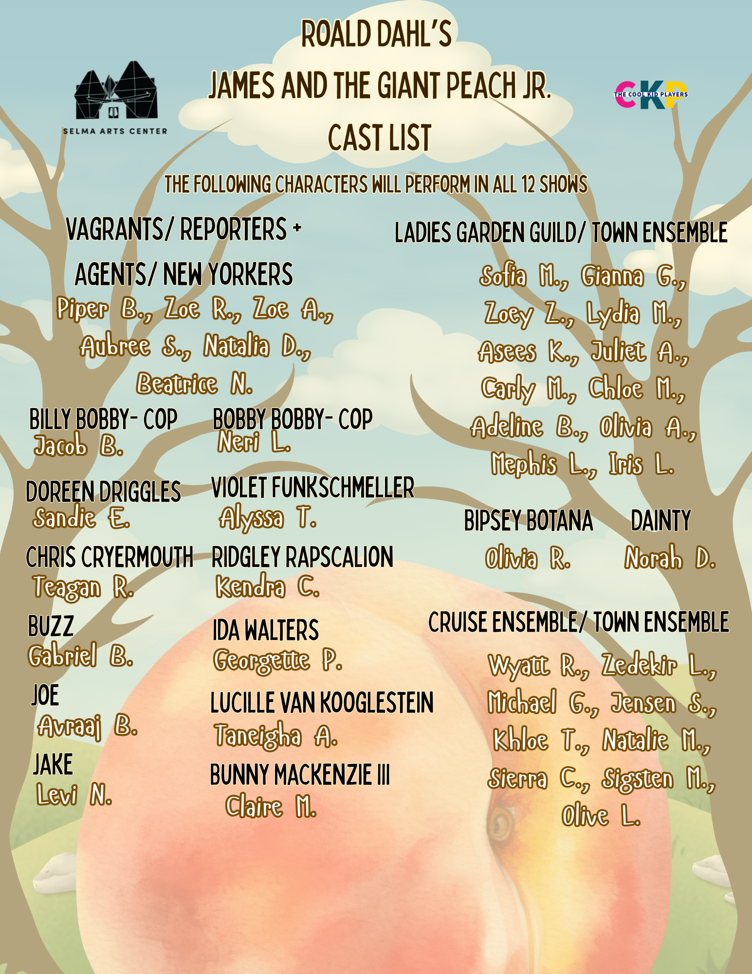 Rehearsals: Rehearsals start January 5th 2026 Rehearsals are 4pm to 6pm, every Monday thru Wednesday at the Selma Arts Center. Some Thursday rehearsals will be scheduled for main characters.  Not everyone is called everyday so please look to the digital calendar on the ‘Parent Spot”.